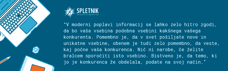 V moderni poplavi informacij se lahko zelo hitro zgodi, da bo vaša vsebina podobna vsebini kakšnega vašega konkurenta. Pomembno je, da v svet pošiljate nove in unikatne vsebine, obenem pa veste, kaj počne vaša konkurenca. Nič ni narobe, če želite bralcem sporočiti isto vsebino. Bistveno je, da temo, ki jo je konkurenca že obdelala, podate na svoj način. Uporabite različne načine, ki smo jih predstavili v tretji točki, razmišljajte bolj široko in jim ponudite še več napotkov, vezanih na temo vaše vsebine. Tudi oblikovanje samega članka je zelo pomembno, saj je to tisto kar bralca pritegne k branju.